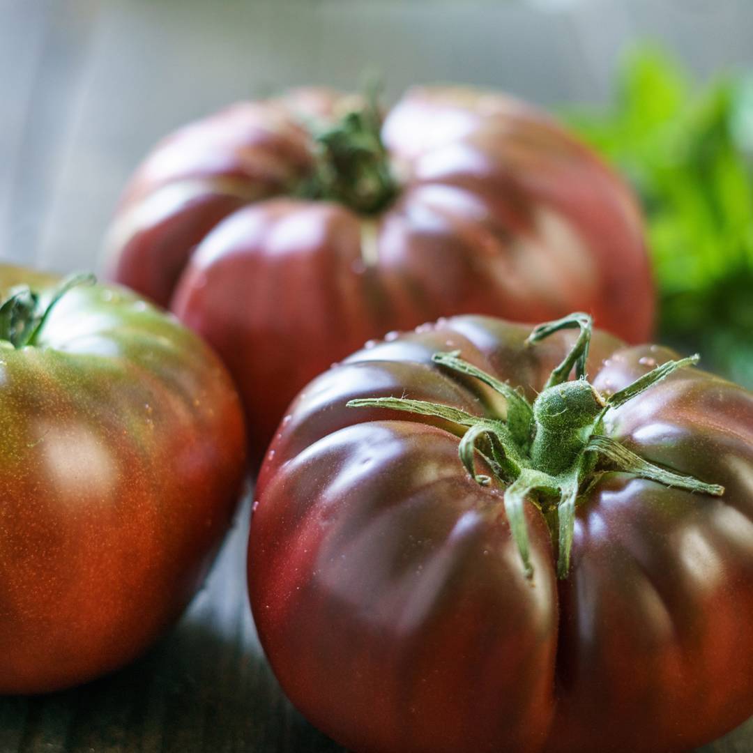 Svart variant av klassiska bifftomaten 'Brandywine' . Får sen skörd av stora plattrunda mörkt mahognyfärgade/brunröda tomater med grönt inslag. Högväxande sort som behöver bindas och tjuvas.