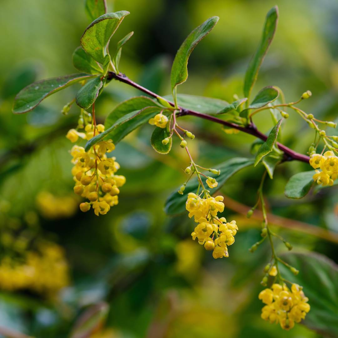 En lövfällande berberisbuske som får ett lågt och kompakt växtsätt. Blommar med klasar av hängande gula blommor och får sen lysande röda bär. Bladverket är grönt som sen skiftar till vackra höstfärger. Passar fint att plantera ensam eller som häck.