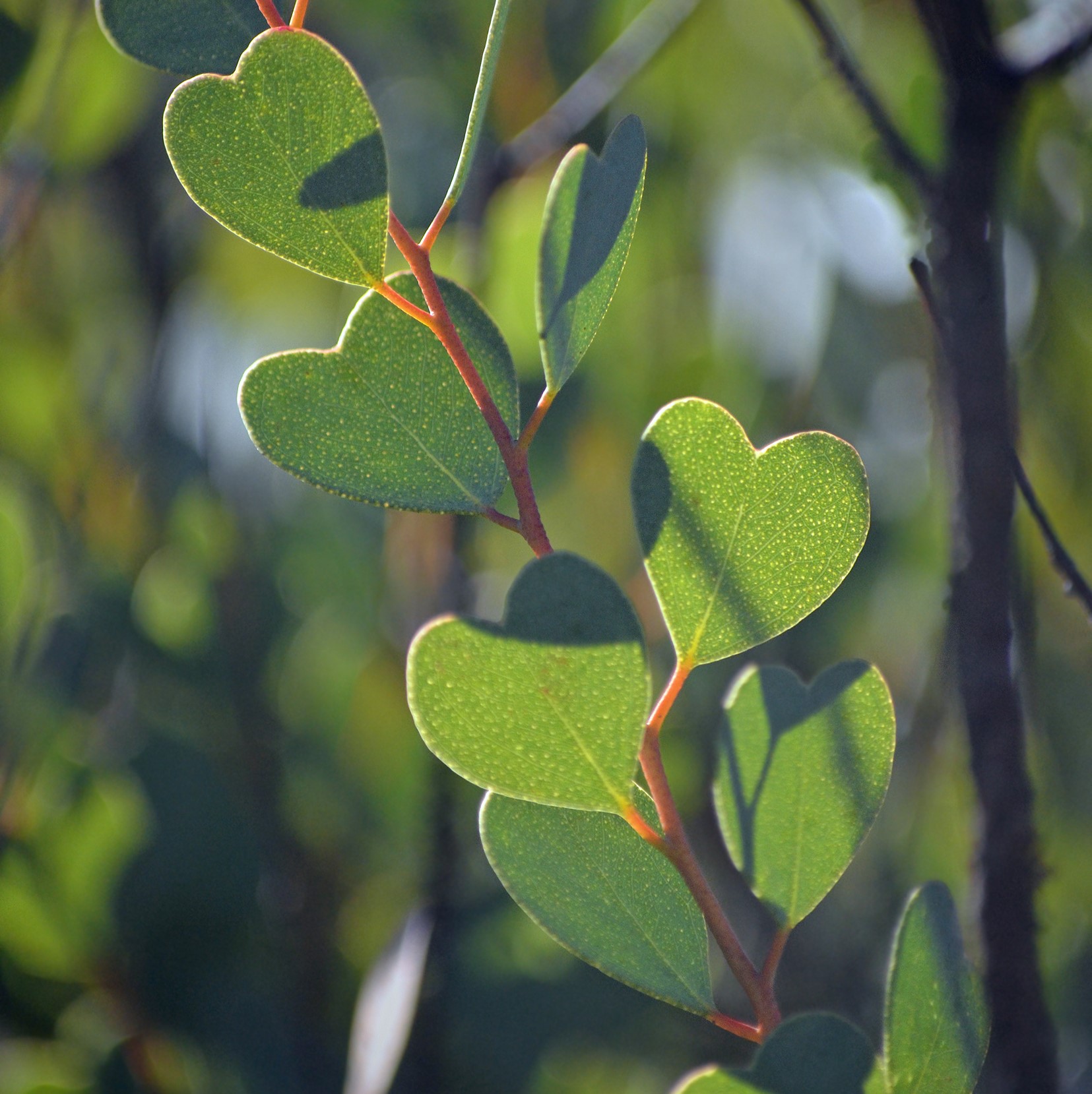 Vacker eukalyptus med grågröna, hjärtformade blad Blommar med gulvita blommor.