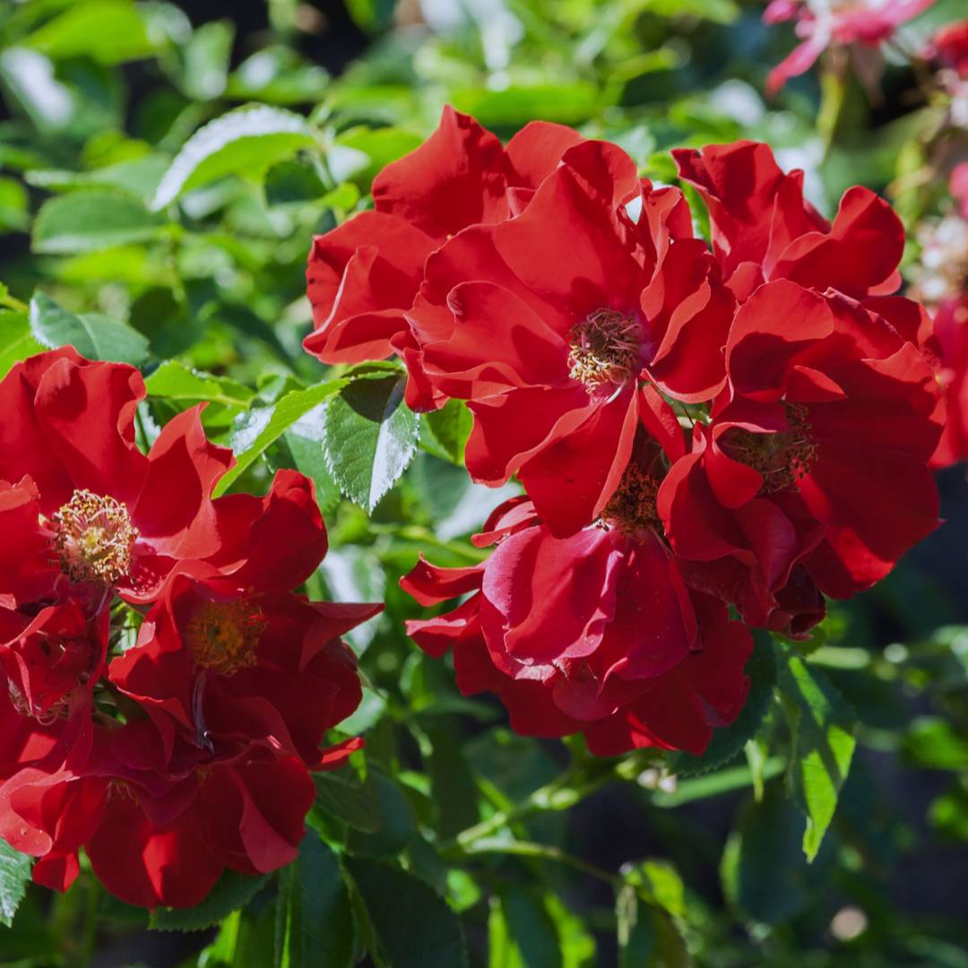 Buskorosen 'Bassino' får små, halvfyllda och klarröda blommor i stora klasar. Växtsättet är tätt och brett och sorten gör sig därför mycket bra som marktäckare eller som låg häck.
