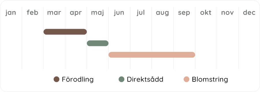 Du kan både förodla och så direkt på din tänkta växtplats. Om du odlar från frö kan du så inomhus i fuktig såjord, i kruka eller brätte. Täck sådden med genomskinlig plast med lufthål och håll fuktigt under tiden fröna gror. När plantorna kikat upp, ställ ljust och svalt och ta bort plasten. Skola om plantorna när de fått sina första s.k. karaktärsblad och är stora nog att hantera. Plantera om i mer näringsrik planteringsjord. När risken för frost är över så kan du börja avhärda dina plantor inför utplantering genom att låta dem vänja sig vid att vara ute, sakta men säkert. Ställ ut dem någon timme i skugga och öka sedan under cirka en veckas tid innan de får komma till sin slutliga växtplats. Du kan också så direkt på växtplatsen när jorden blivit uppvärmd. Vattna före du sår och håll fuktigt under tiden fröna gror.