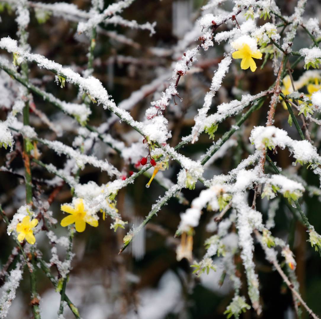 Vinterjasminen kan beskäras på våren, efter blomningen. Den tål hårdare beskärning.