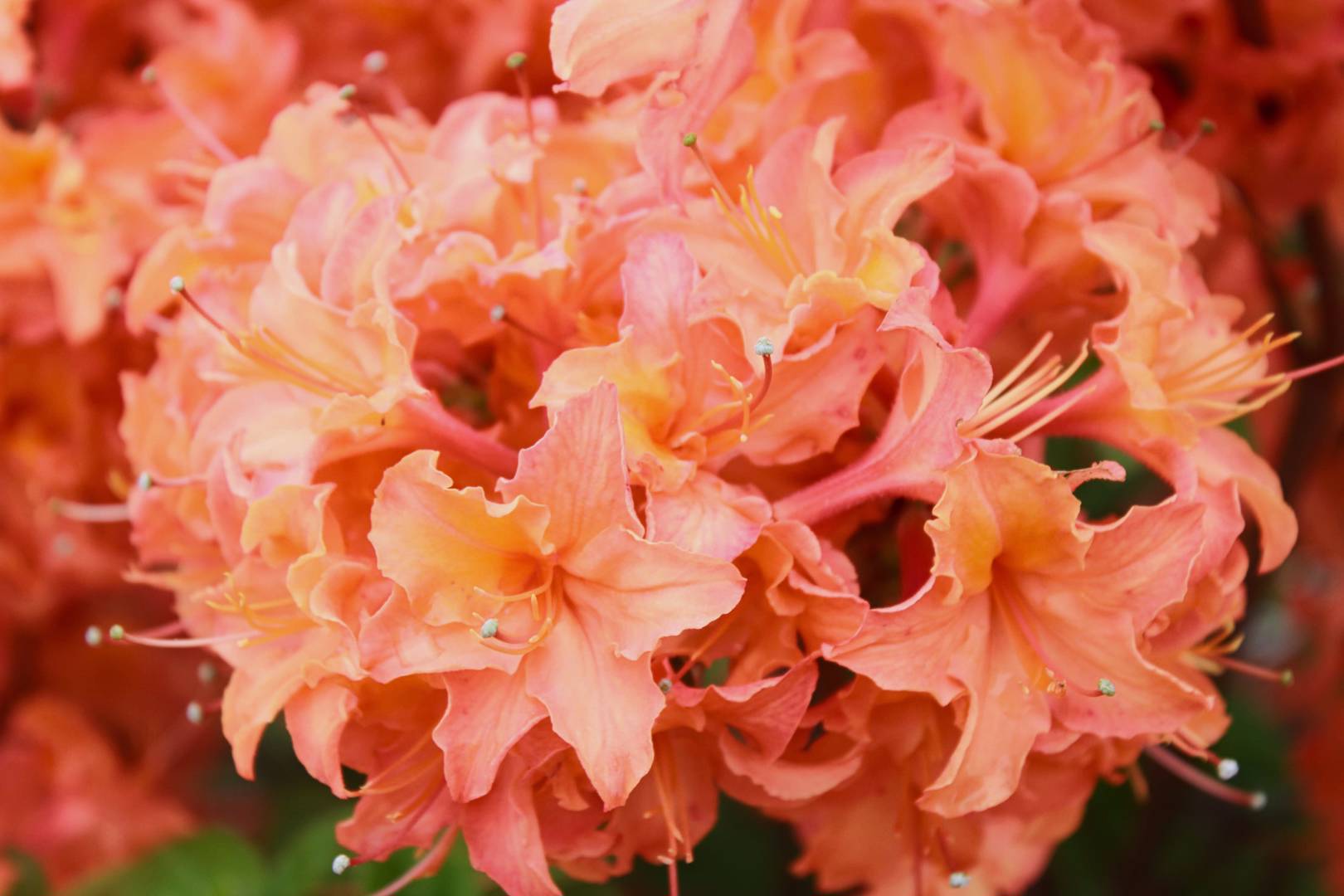 Vacker azalea med orangeröda blommor och grönt bladverk som skiftar till röd på hösten.