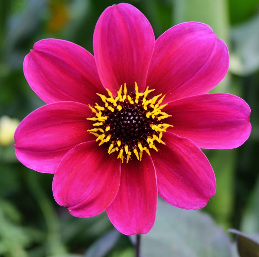 Enkelblommande dahlia med blommor i purpurfärg och mörkt purpurfärgat bladverk. Blir upp till 60 cm hög och passar t ex fint i kruka eller som kantväxt.