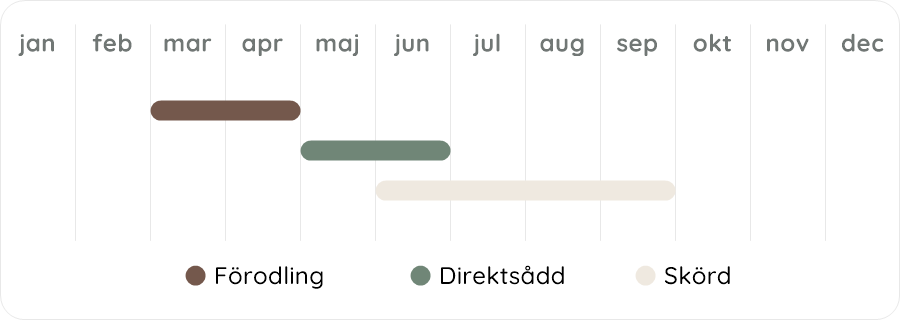 Du kan också så direkt på växtplatsen när jorden blivit varm. Vattna då jorden före sådd och håll fuktigt under grotiden. Täck gärna med fiberduk under starten.