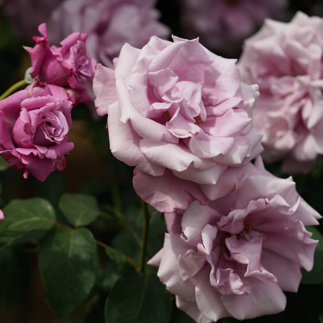 Tehybridros som blommar med fyllda, syrenlila blommor med stark doft. Växtsättet är buskigt med grönt, läderaktigt bladverk.