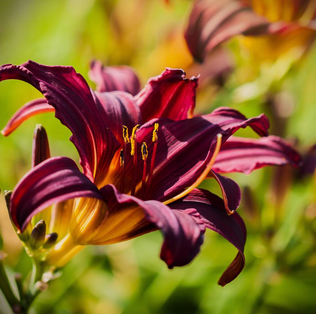 Eleganta dagliljan 'American Revolution' blommar med mörkt purpurröda trumpetliknande blommor. Dagliljor blommar bara en dag, men eftersom de blommar rikligt och länge så har man vackra blommor under en lång period. Blommor och knoppar är ätbara.