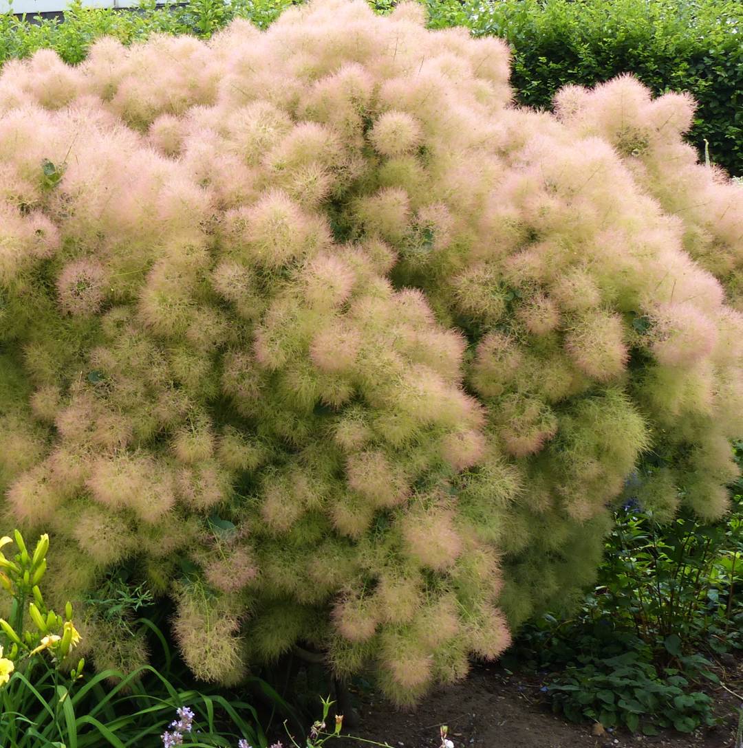 Perukbuske som får ett vackert grönt bladverk. Blommorna blir som perukliknande plymer i gulrosa.