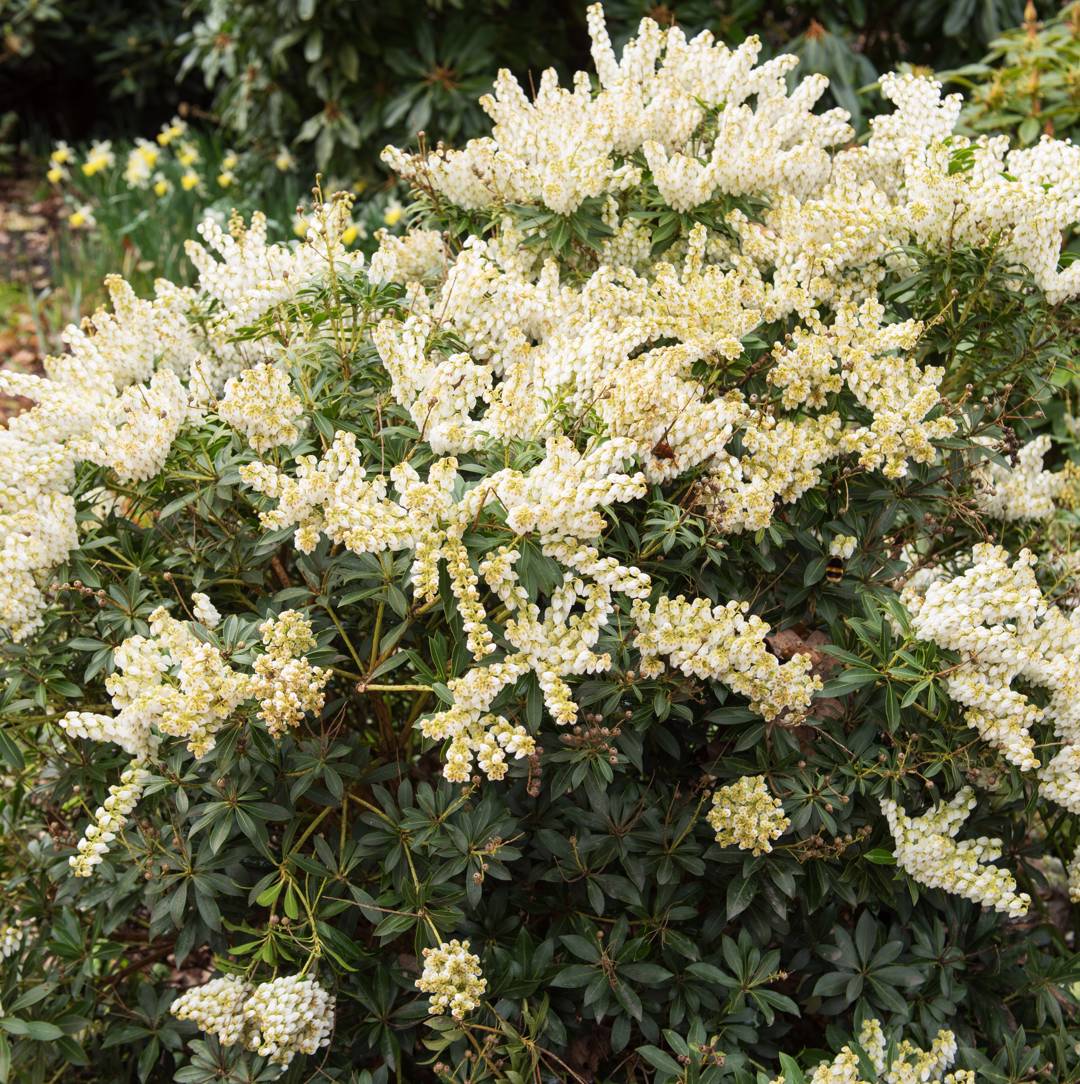 Underbar buske som får rosa knoppar som spricker ut i gräddvita klasar med liljekonvaljlika blommor på våren. Kompakt sort med mörkt grönt och glänsande bladverk som håller sig vintergrönt.