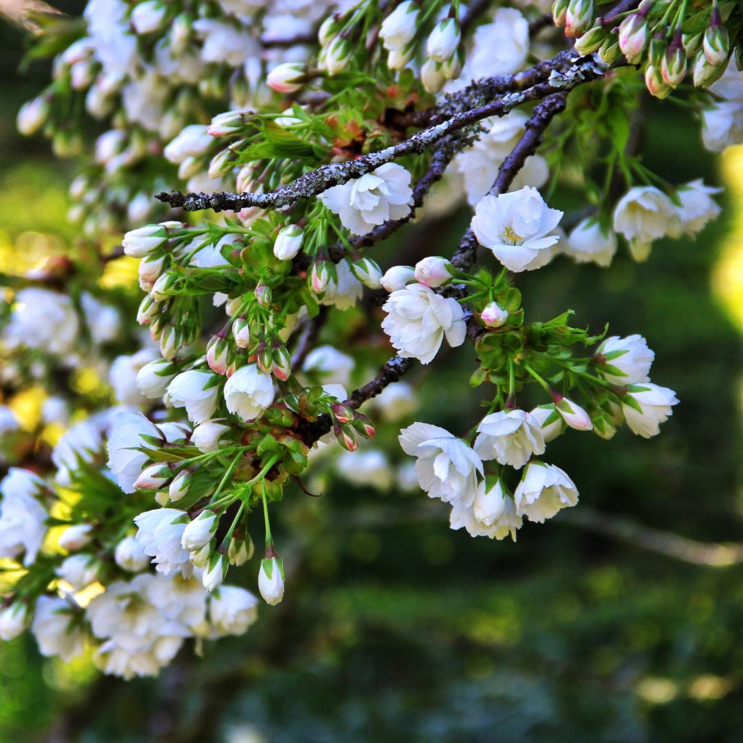 Vackert körsbärsträd som blommar med fyllda vita blommar i maj. Det bildas inga frukter eftersom trädet är sterilt.