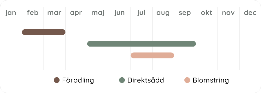 Omskola när plantorna har fått sina första s.k. karaktärsblad. Avhärda plantorna och plantera ut när risk för frost är över. De flesta sorter kommer blomma första nästa år.