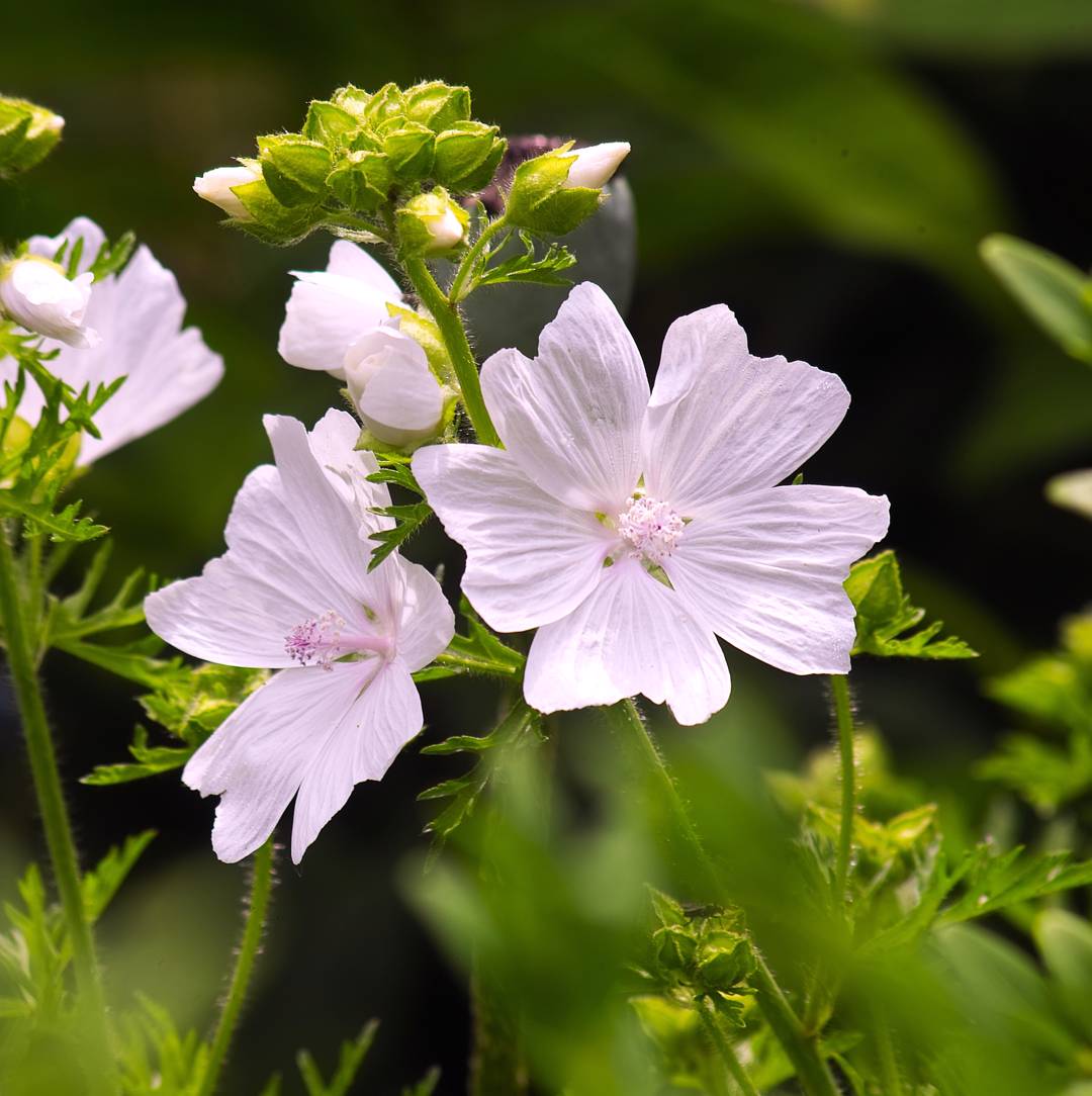 Myskmalva 'Alba' får massvis av vita eller ljust rosa trattformade blommor. Myskmalvan är en klassisk gammal torparväxt som får rikligt med blommor och ett bladverk som doftar svagt av mysk. Fin i lite vildare rabatter.
