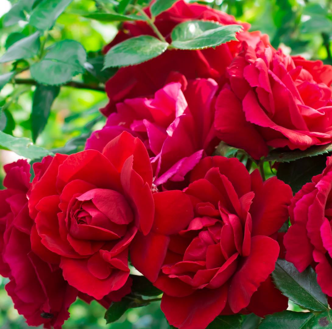 Klättrande 'Flammentanz' får klasar av fyllda, röda blommor som doftar svagt. Kraftigt och friskt växtsätt.