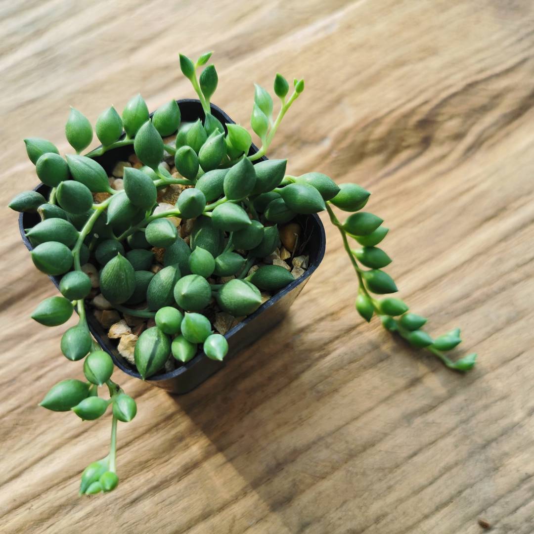Bönor på Tråd är en tropisk växt som har sitt ursprung i Afrika. Det är en suckulent som får gröna, avlånga blad på långa rankor, som små bönor trädda på en tråd. Växtsättet är slingrande eller klättrande och passar bra i ampel. Bönor på Tråd kan blomma med klasar av ljusa borstlika blommor.