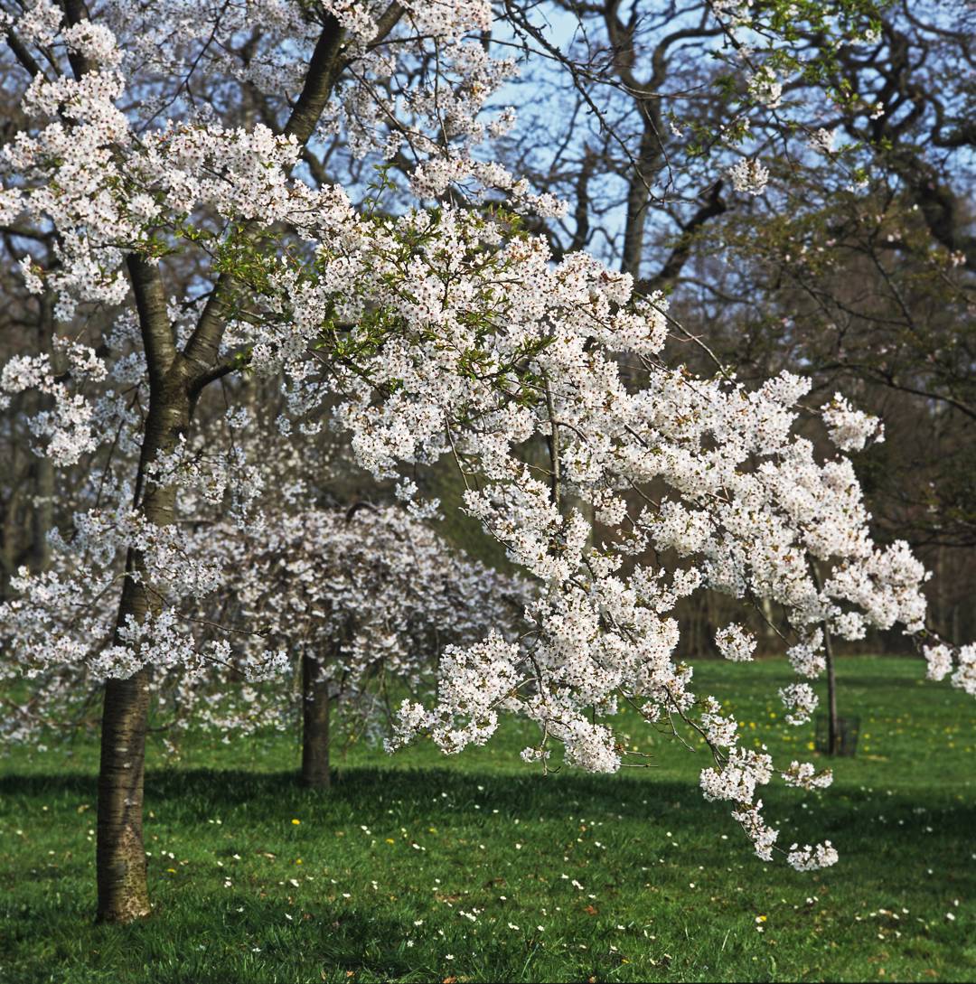 Vackert mindre träd som blommar på våren med massor av vita enkla blommor med blekt rosa skimmer på hängande grenar. Trädet får en vacker och bred, luftig krona.