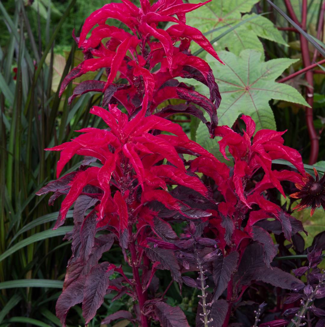Färgstark papegojamarant som får mörkt chokladbrunt bladverk med djupröd krona.