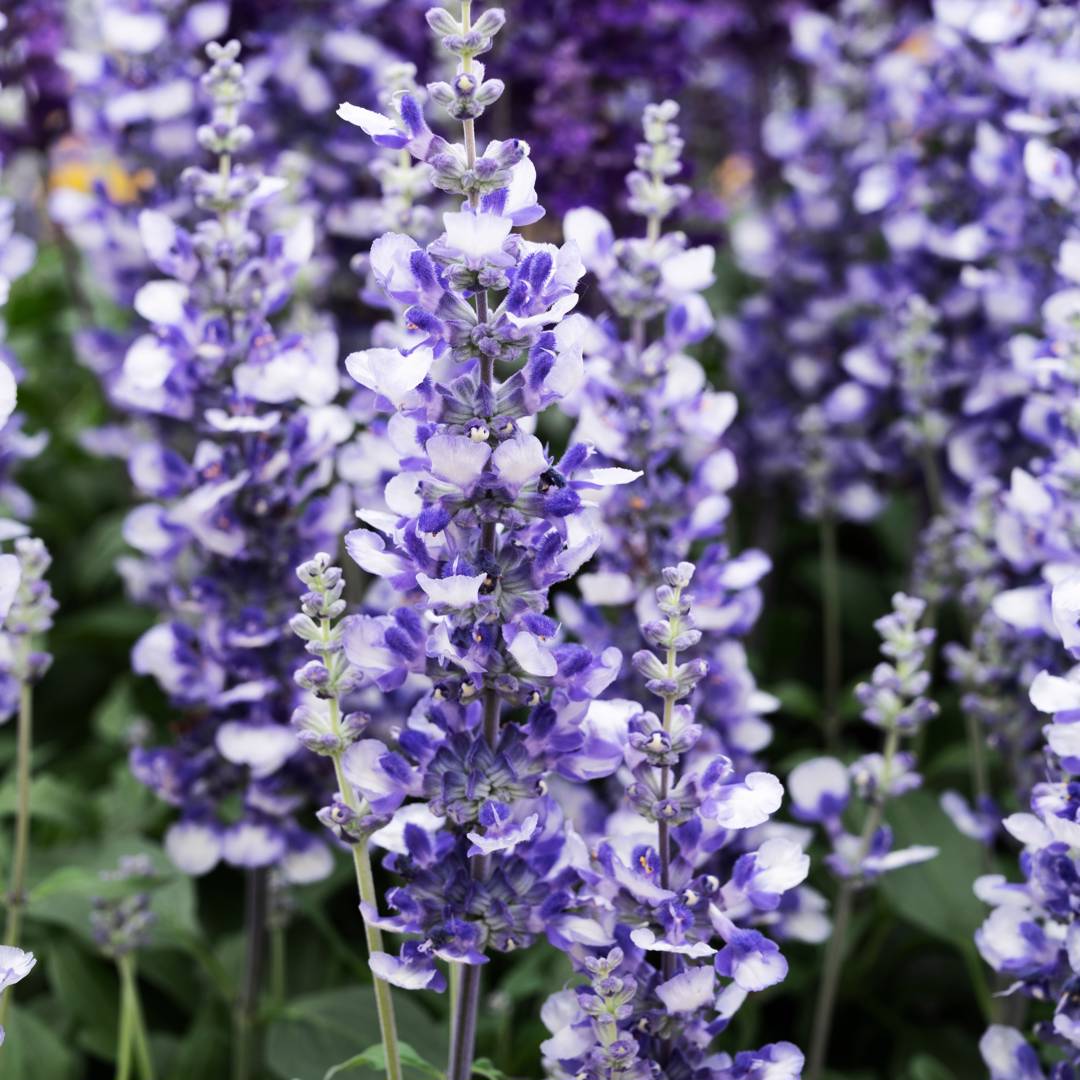 Vacker daggsalvia som får blå och vita blomspiror. Vacker som snittblomma och drar till sig pollinatörer.