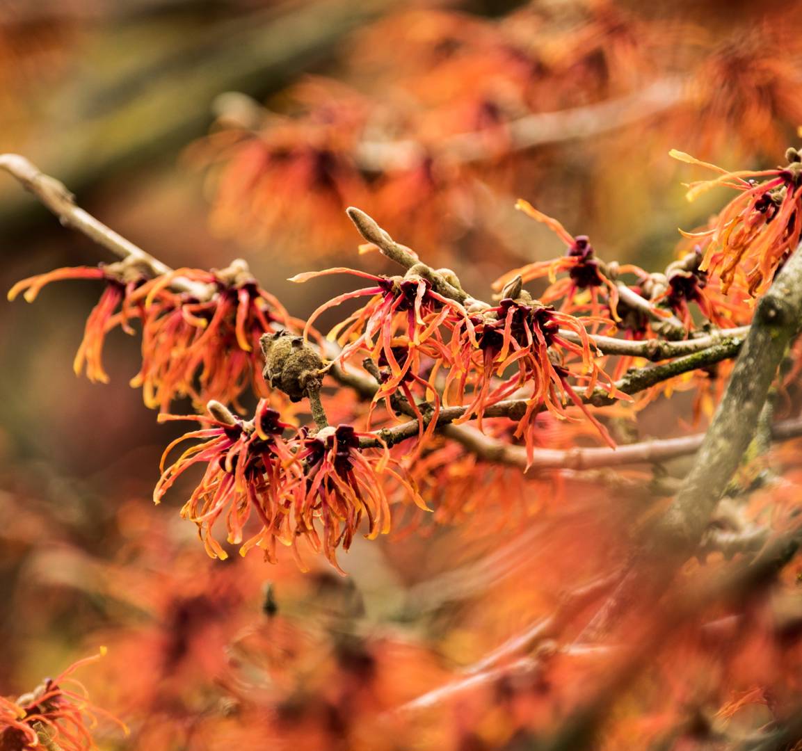 ‘Jelena’ är en stämningsfull sort av trollhassel som blommar redan på vinter/vårgränsen – oftast i februari–mars – med kopparorange, spindellika blommor direkt på de kala grenarna. Blomningen ger ett färgsprakande avbrott i den annars vilande trädgården. Bladverket är vackert grönt under säsongen och får lysande höstfärger i rött och orange. Busken har ett brett, elegant växtsät.